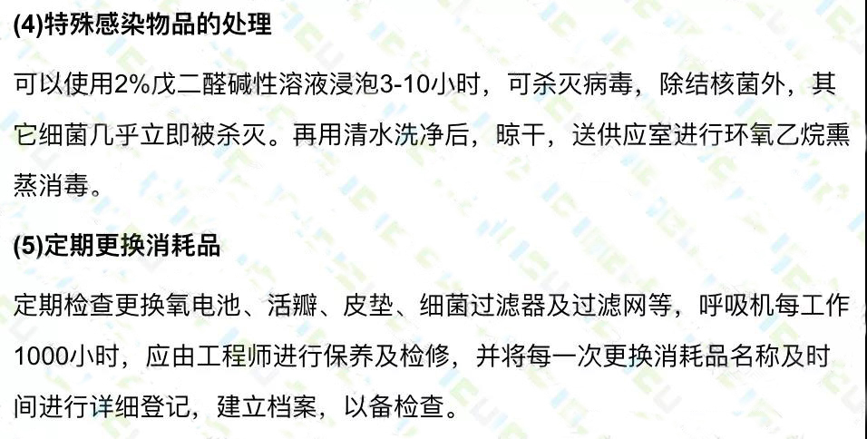 呼吸機的消毒應(yīng)遵循先徹底清洗,尤其是接觸患者的呼出氣體的部分,如管道、加溫濕化器和呼氣閥等(部分呼吸機帶細菌過濾器),可先用清洗劑沖洗,將其中的分泌物,痰痂等徹底清除,然后再消毒。消毒后經(jīng)蒸餾水沖洗晾干備用。經(jīng)化學(xué)消毒劑消毒后的呼吸機管路應(yīng)用蒸餾水清洗,而不建議用自來水,以免造成不必要的污染。