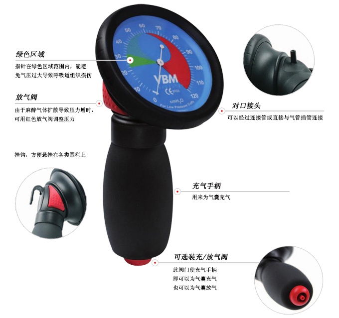▲由于氣囊長時間連接著氣管導管,測壓表可用來監(jiān)測和通過紅色的壓力釋放閥來調(diào)整壓力值在正常范圍。