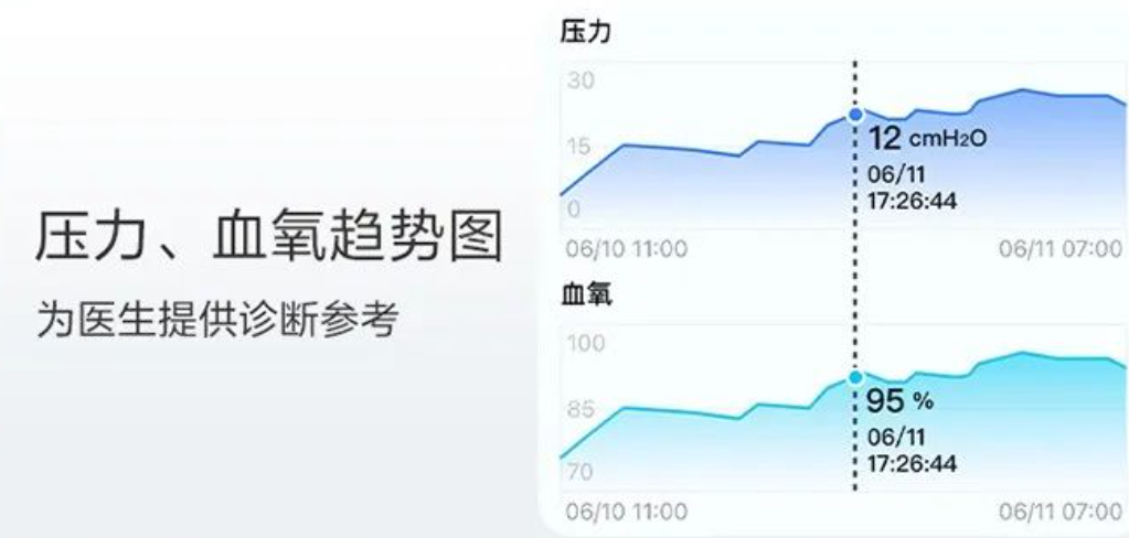 - 準(zhǔn)確識別 OA,CA,H,LL 等呼吸事件,智能調(diào)節(jié)提供更舒適呼吸體驗。
