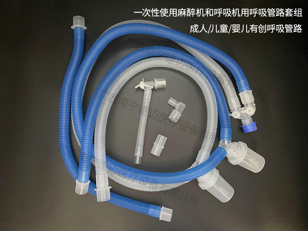 適用范圍: 搭配有創(chuàng)呼吸機(jī)使用,適用于麻醉機(jī)、呼吸機(jī)接口與供氧面罩的管路連接,作為麻醉氣體、氧氣進(jìn)入人體內(nèi)的通道。 1、結(jié)構(gòu)組成 一次性使用麻醉機(jī)和呼吸機(jī)用呼吸管路套組包括單管路型和雙管路型,由波紋管、接頭(直型、Y型、L型、T型)、轉(zhuǎn)換接頭、集水杯(選配)、壓力管(選配)、延長管(選配)、單向閥(選配)和儲氣囊(選配)組成。以無菌形式提供,經(jīng)環(huán)氧乙烷滅菌,一次性使用。