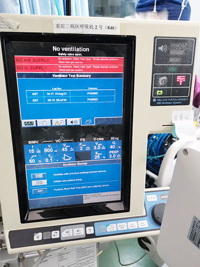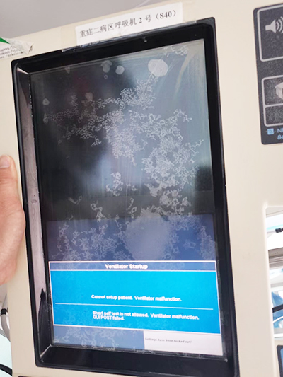 故障現(xiàn)象: 呼吸機(jī)報(bào)警:氧氣濃度過低,其他正常。 故障分析: PB840呼吸機(jī)氧濃度過低報(bào)警一般原因有:墻面供氧壓力不足;氧電池失效造成氧濃度檢測不準(zhǔn)確;氧氣流量傳感器出現(xiàn)故障。分析原因后進(jìn)行故障排查和檢修。 解決方法: 第一步校準(zhǔn)氧氣流量傳感器,結(jié)果通過,但出現(xiàn)錯(cuò)誤提示; 第二步檢查中心供氧進(jìn)入病區(qū)的氧氣壓力,壓力表顯示氧氣壓力正常,排除氧氣壓力故障; 第三步測量氧氣傳感器連接線,接線正常且外觀正常,則考慮是否是氧電池有問題。 監(jiān)測氧濃度的氧電池位于呼吸輸送系統(tǒng)的呼入管道內(nèi),氧電池用于監(jiān)測混合氣體的氧濃度。PB840呼吸機(jī)氧電池使用壽命為一年左右。 排除上述原因后,確定是氧電池的故障。 更換氧電池后開機(jī),進(jìn)行EST自檢,檢測通過,再次使用,檢查氧濃度設(shè)定值與所監(jiān)測到的供氣氧濃度相吻合,且線性變化良好,一切正常,故障解除。 二、無法連接設(shè)置病人 故障現(xiàn)象: 呼吸機(jī)開機(jī)后顯示無法連接設(shè)置病人,呼吸機(jī)錯(cuò)誤,且有聲光報(bào)警。 故障分析: 重新開機(jī),報(bào)警依舊,由于呼吸閥測試屬于擴(kuò)展式自檢,所以進(jìn)行擴(kuò)展式自檢,結(jié)果失敗,提示有兩個(gè)錯(cuò)誤,再次測試,結(jié)果未變,查看維修手冊,錯(cuò)誤提示為流量傳感器故障。 解決方法: 先拆開設(shè)備查看呼吸模塊其他元件,發(fā)現(xiàn)在呼氣閥的密封墊上有很多雜物,判斷這些雜物破壞呼氣閥的密封性,導(dǎo)致流量監(jiān)測偏離實(shí)際值。 用醫(yī)用消毒酒精清潔,裝好后再次測試,結(jié)果通過,故障解除。 排除了流量傳感器的故障,節(jié)約了成本。 三、嚴(yán)重阻塞報(bào)警 故障現(xiàn)象: PB840呼吸機(jī)在運(yùn)行過程出現(xiàn)嚴(yán)重阻塞報(bào)警。 故障分析: PB840呼吸機(jī)在運(yùn)行過程中出現(xiàn)阻塞報(bào)警,通常是由兩種情況導(dǎo)致,可能是管道出現(xiàn)積水或折疊,,也可能是吸入端或呼出端發(fā)生過濾器堵塞。 一、此種情況下,報(bào)警會出有兩種顯示:即Severe ocelusion和Screen blocked。 ① 如果呼吸機(jī)顯示Severe ocelusion,就表明呼吸機(jī)管道出現(xiàn)了阻塞,清理管道異物或更換管路就可解決。 ② 如果呼吸機(jī)顯示Screen blocked,,就提示呼吸機(jī)觸摸屏感應(yīng)出現(xiàn)了故障。 二、觸摸屏感應(yīng)故障分為3種情況:局部失靈、反應(yīng)遲鈍和根本無反應(yīng)。 ① 局部失靈一般由紅外發(fā)射或接收損壞導(dǎo)致; ② 反應(yīng)遲鈍一般是屏幕外框集聚了過多灰塵,阻斷了紅外發(fā)射和接收,也有可能是內(nèi)部灰塵多; ③ 根本無反應(yīng)則是因內(nèi)部觸摸框板固定不佳,出現(xiàn)偏位,重新固定或調(diào)整能解決。 ④ 如是根本不靈敏,可能是觸摸框板損壞或顯示屏主板壞。 解決方法: 先對外部管路進(jìn)行檢查,包括呼出過濾器、吸入過濾器、積水杯等,并檢查呼吸管道是否有積水、分泌物過多或折疊,如果均正常的話,就運(yùn)行快速自檢。在自檢過程中,如果流量傳感器不能通過測試,且出現(xiàn)錯(cuò)誤代碼FS0001和FS0003,就說明呼出端過濾器出現(xiàn)故障。 呼出過濾器內(nèi)部的過濾紙應(yīng)保持干燥,如果發(fā)現(xiàn)進(jìn)水痕跡,則用高溫高壓消毒烘干,或者進(jìn)行更換,呼吸機(jī)就可正常運(yùn)行。 注意事項(xiàng): 呼出過濾器拆裝過程中,必須要確保過濾器內(nèi)的過濾紙干燥,也不能將其倒放,防止積水杯的液體倒流,使過濾紙進(jìn)水受損。 在消毒呼氣過濾器的時(shí)候,應(yīng)對其密封圈同步消毒,消毒完成后,將密封圈固定好,避免出現(xiàn)漏氣問題。 四、潮氣量偏低 故障現(xiàn)象: 患者參數(shù)設(shè)置中潮氣量為500ml,實(shí)際潮氣量偏低。 故障分析: 如果呼吸機(jī)提示患者潮氣量嚴(yán)重偏低,將呼吸機(jī)潮氣量設(shè)定為450mL,則顯示呼出潮氣量為340mL左右。若患者狀態(tài)正常,出現(xiàn)這種問題的主要原因有三種:一是患者回路漏氣;二是主動呼出閥臟;三是流量傳感器故障。 解決方法: 若系統(tǒng)診斷日志未出現(xiàn)報(bào)錯(cuò)提示,就運(yùn)行SST檢查呼吸回路是否正常。 如流量傳感器通不過檢查,可暫時(shí)忽略,繼續(xù)進(jìn)行檢查,直到排除呼吸回路漏氣問題。排除漏氣問題后,再運(yùn)行EST,觀察漏氣測試能否通過測試,如出現(xiàn)測試錯(cuò)誤,則檢查和清洗呼出閥。 清洗時(shí),應(yīng)卸下密封圈,使用乙醇進(jìn)行清洗,可解決故障。 再次運(yùn)行EST進(jìn)行復(fù)試,如果系統(tǒng)仍然提示流量傳感器測試通不過,就需要觀察上半屏流量傳感器數(shù)據(jù)。 如果在測試過程中,氧流量傳感器為120L/min時(shí),呼出流量傳感器為100L/min,當(dāng)空氣流量傳感器為120L/min時(shí),呼出流量傳感器仍為100L/min,就可以判定呼出端流量傳感器出現(xiàn)故障,只要將故障流量傳感器更換即可。 五、GUI顯示屏上半屏黑屏 故障現(xiàn)象: 開機(jī)后,呼吸機(jī)GUI上半屏黑屏,下半屏顯示正常。 故障分析: 在PB840呼吸機(jī)故障中,GUI顯示屏故障比較常見。呼吸機(jī)的GUI兩個(gè)液晶顯示屏,均借助獨(dú)立排線與GUICPU板直接連接,如果兩個(gè)液晶屏同時(shí)發(fā)生故障,就先檢查GUI CPU板。 黑屏的故障原因