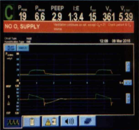 當(dāng)呼吸機(jī)主顯示界面報(bào)NO O? SUPPLY,查看報(bào)警后提示:Ventilation continues as set. Except O2=21. Check patient & O? source,此時(shí)考慮呼吸機(jī)氧氣氣源連接是否順暢,也可能是氧氣氣源壓力不夠?qū)е隆?/span>