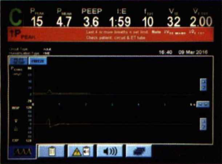 對(duì)于此類(lèi)警報(bào)時(shí)立即檢查呼吸輸送系統(tǒng)是否有漏氣,患者阻力和順應(yīng)性是否發(fā)生改變。